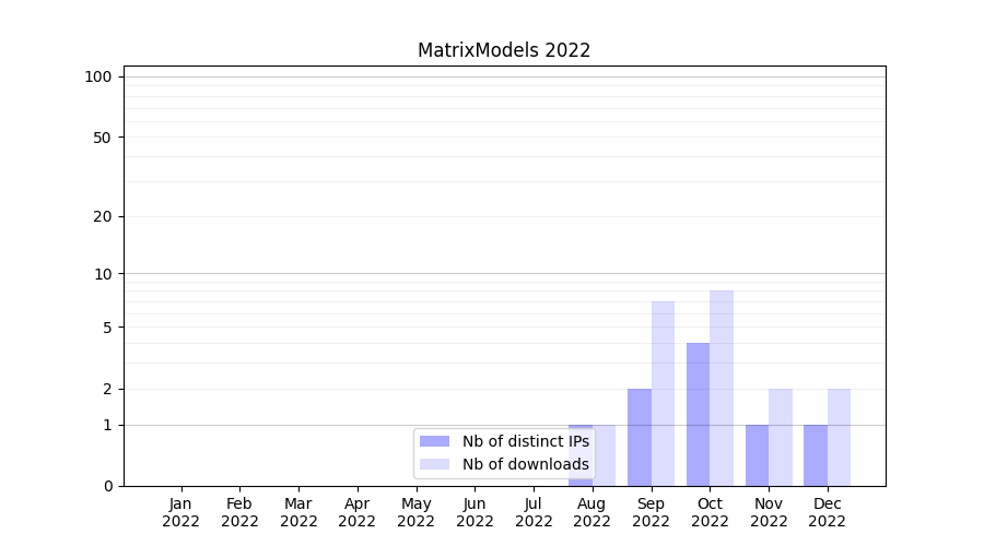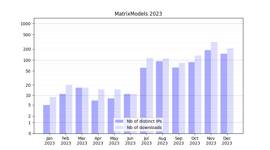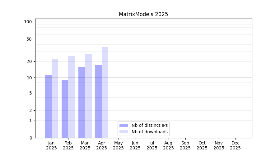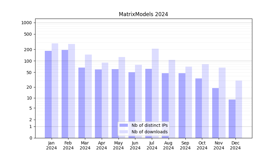 Number of downloads for software package MatrixModels, year by year, from 2025 back to 2014 (years with no downloads are omitted):