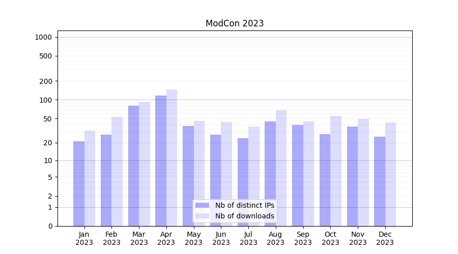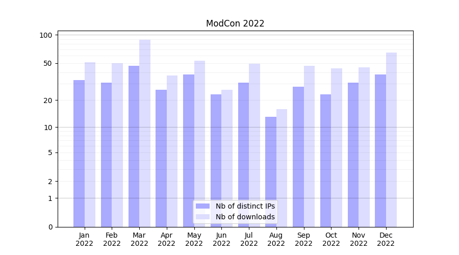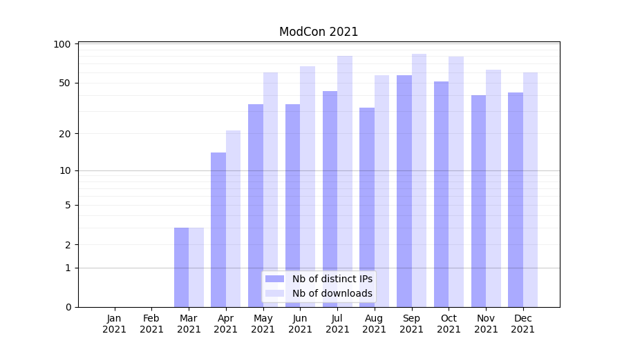 Number of downloads for software package ModCon, year by year, from 2025 back to 2014 (years with no downloads are omitted):