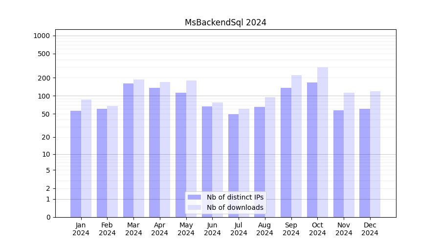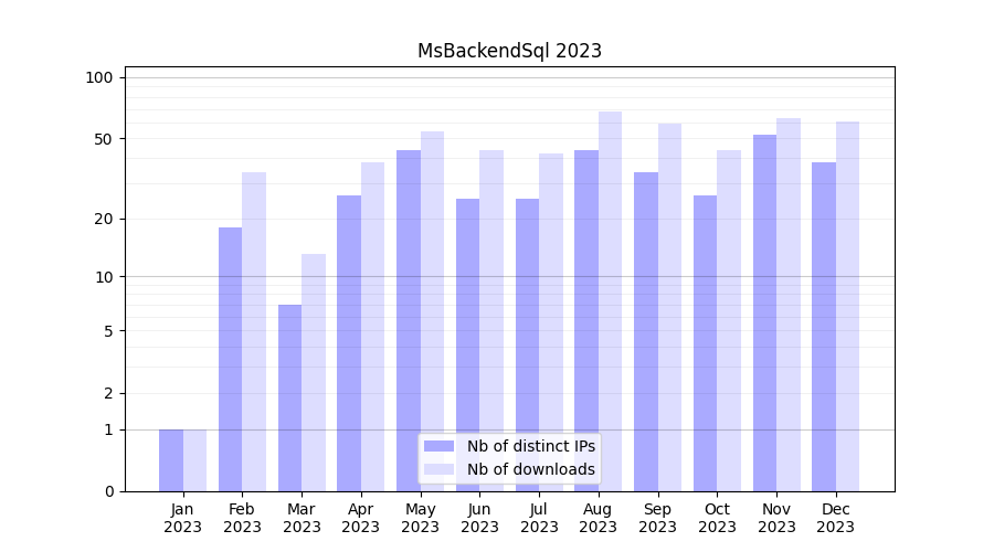 Number of downloads for software package MsBackendSql, year by year, from 2025 back to 2014 (years with no downloads are omitted):