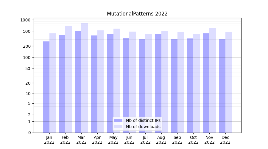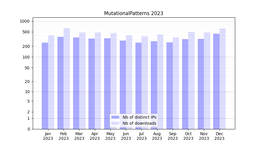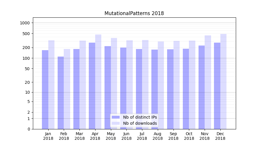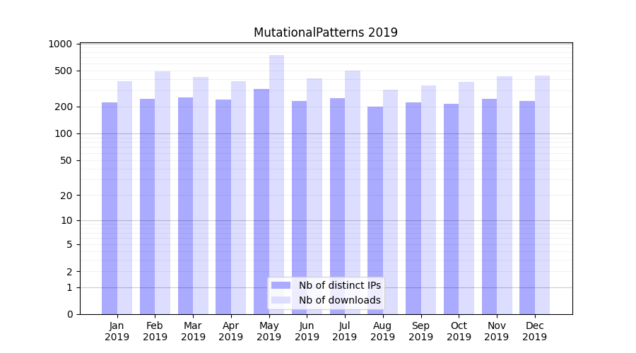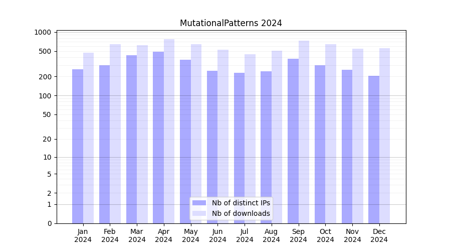 Number of downloads for software package MutationalPatterns, year by year, from 2025 back to 2014 (years with no downloads are omitted):