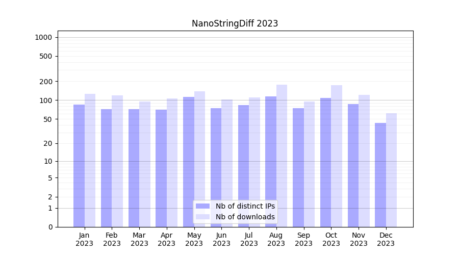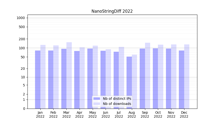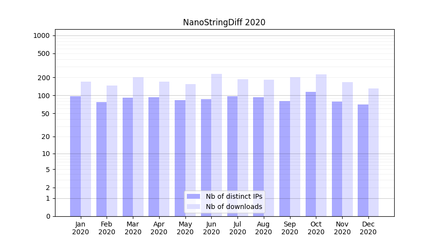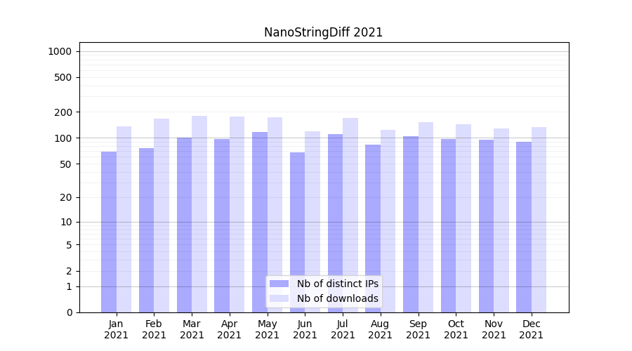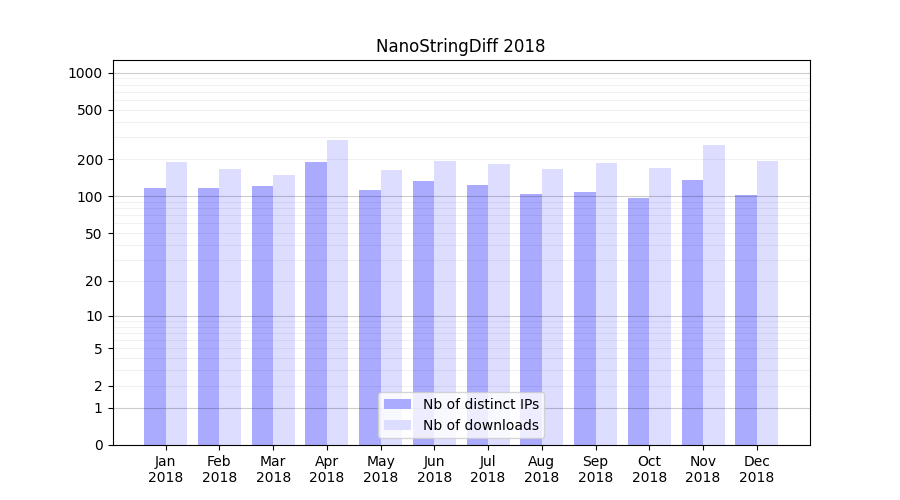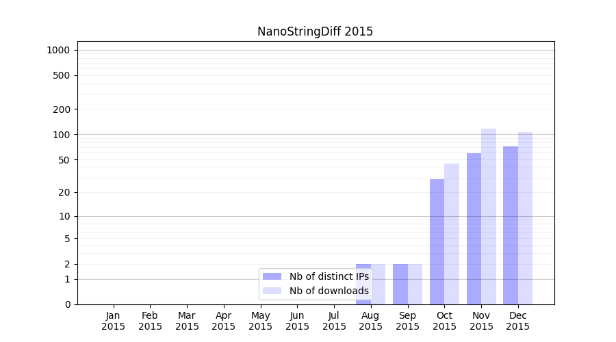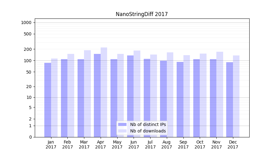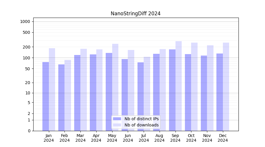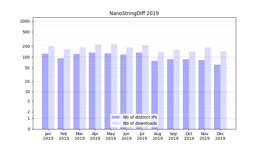 Number of downloads for software package NanoStringDiff, year by year, from 2025 back to 2014 (years with no downloads are omitted):