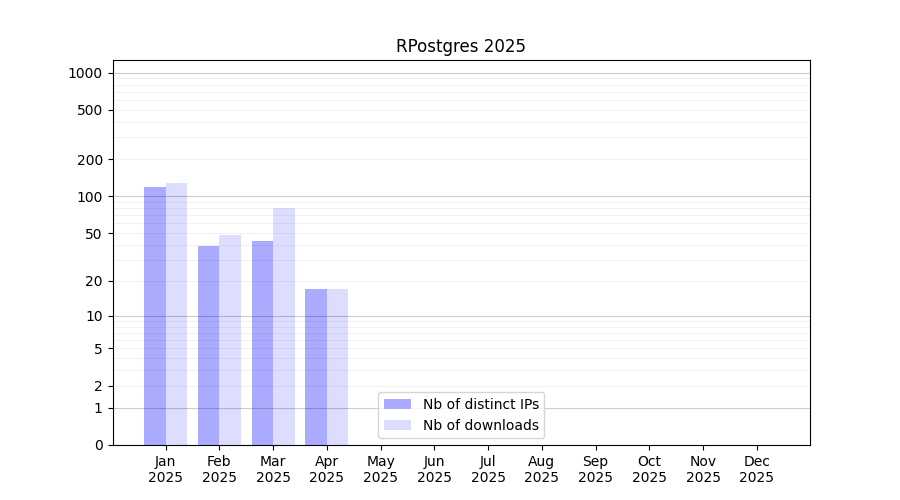 Number of downloads for software package RPostgres, year by year, from 2025 back to 2014 (years with no downloads are omitted):