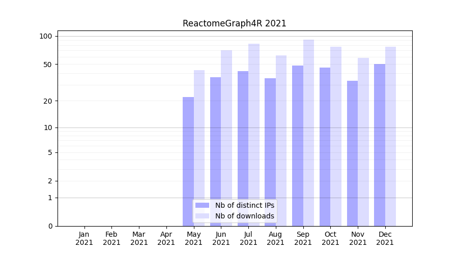 Number of downloads for software package ReactomeGraph4R, year by year, from 2025 back to 2014 (years with no downloads are omitted):