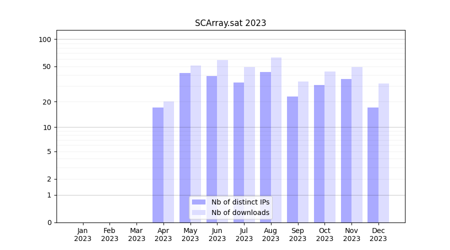 Number of downloads for software package SCArray.sat, year by year, from 2025 back to 2014 (years with no downloads are omitted):