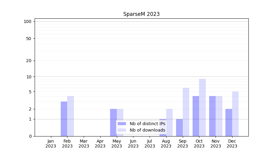 Number of downloads for software package SparseM, year by year, from 2025 back to 2014 (years with no downloads are omitted):