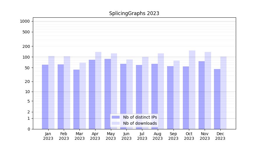Number of downloads for software package SplicingGraphs, year by year, from 2025 back to 2014 (years with no downloads are omitted):