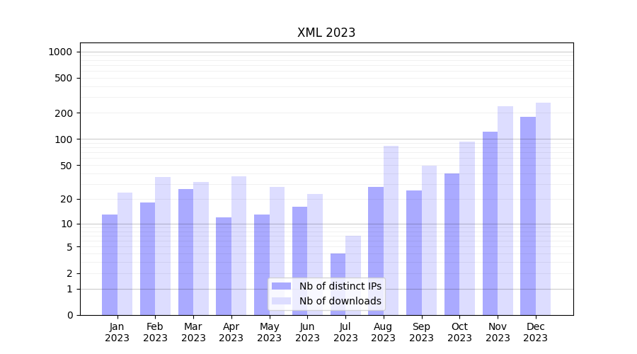 Number of downloads for software package XML, year by year, from 2025 back to 2014 (years with no downloads are omitted):