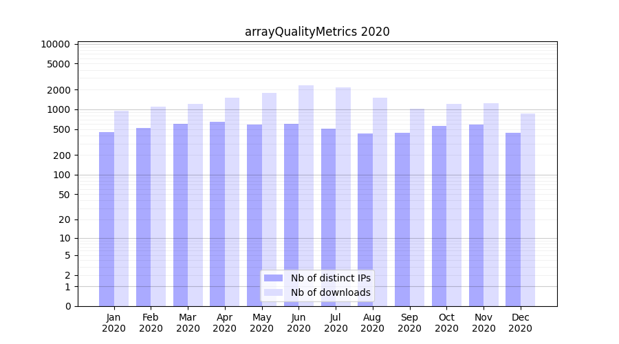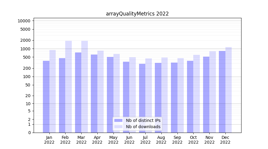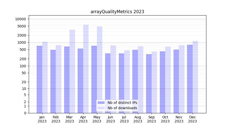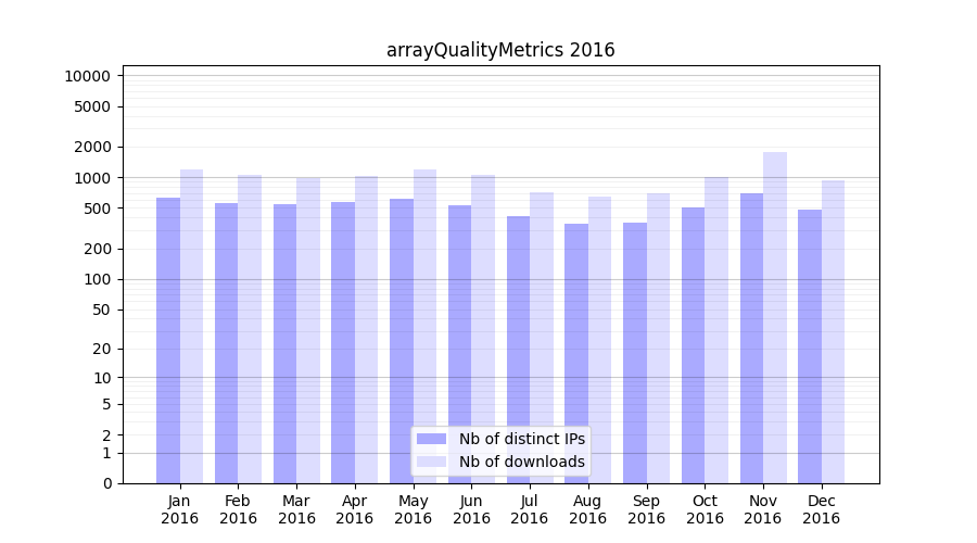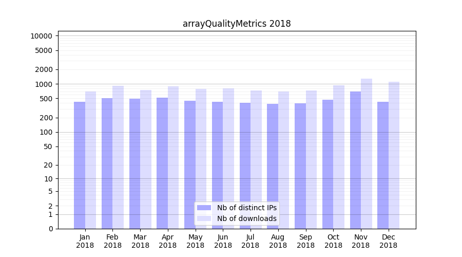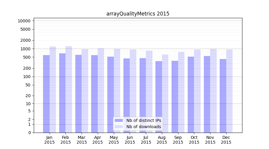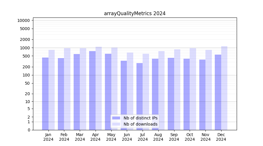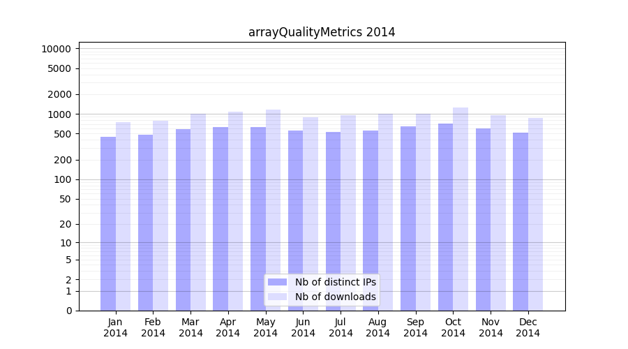 Number of downloads for software package arrayQualityMetrics, year by year, from 2025 back to 2014 (years with no downloads are omitted):