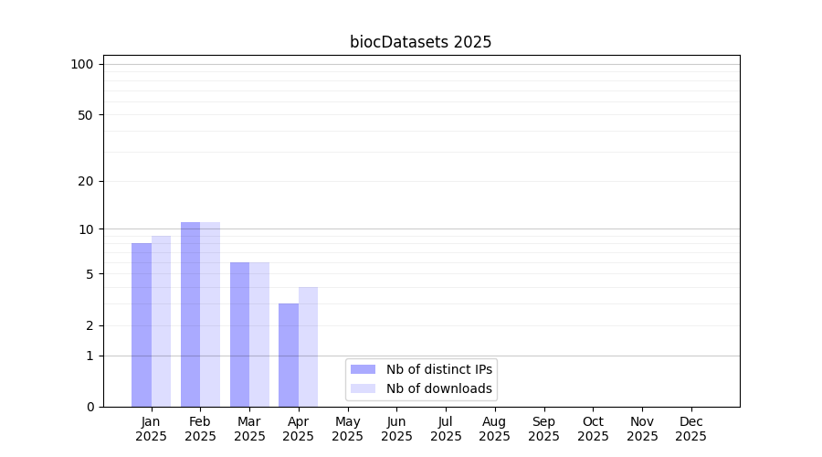 Number of downloads for software package biocDatasets, year by year, from 2025 back to 2014 (years with no downloads are omitted):