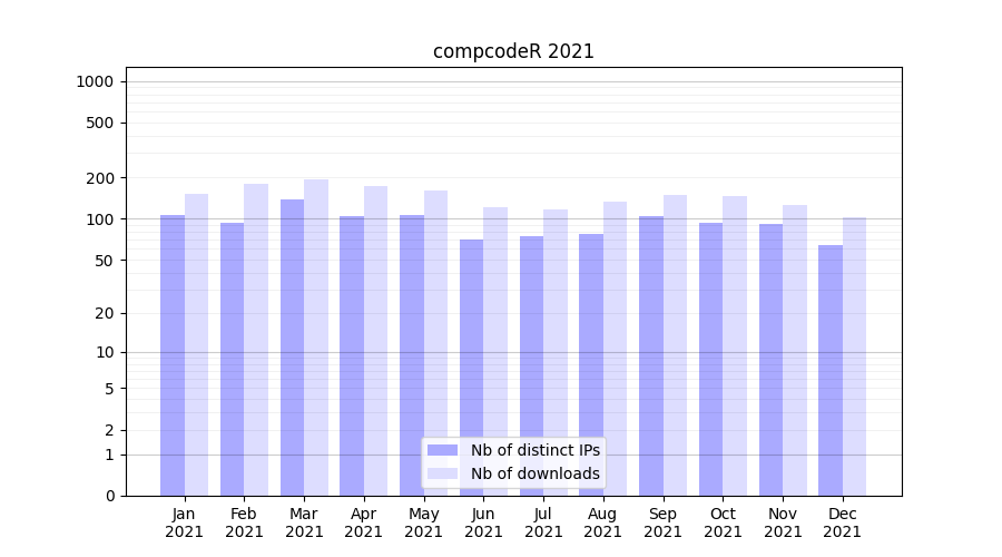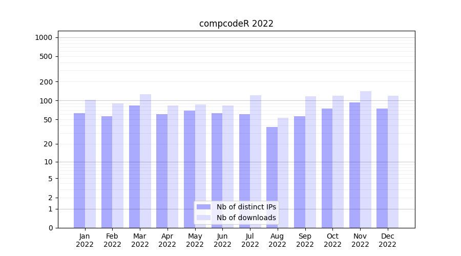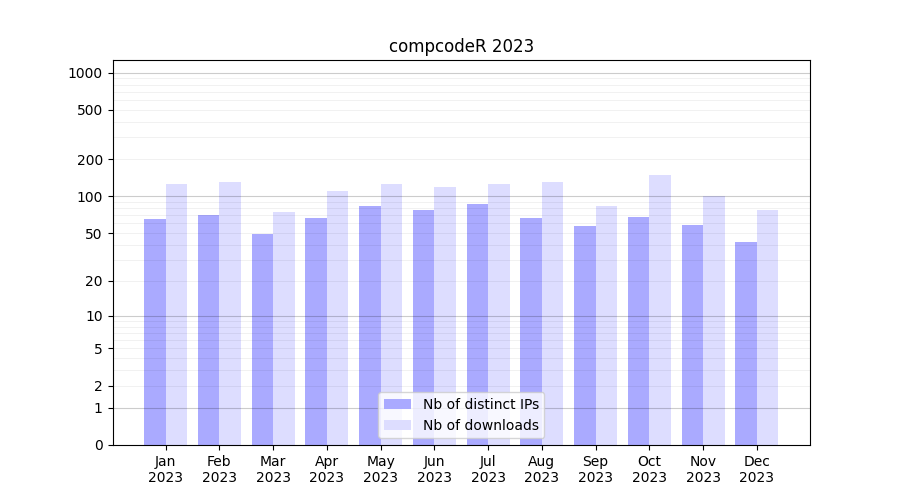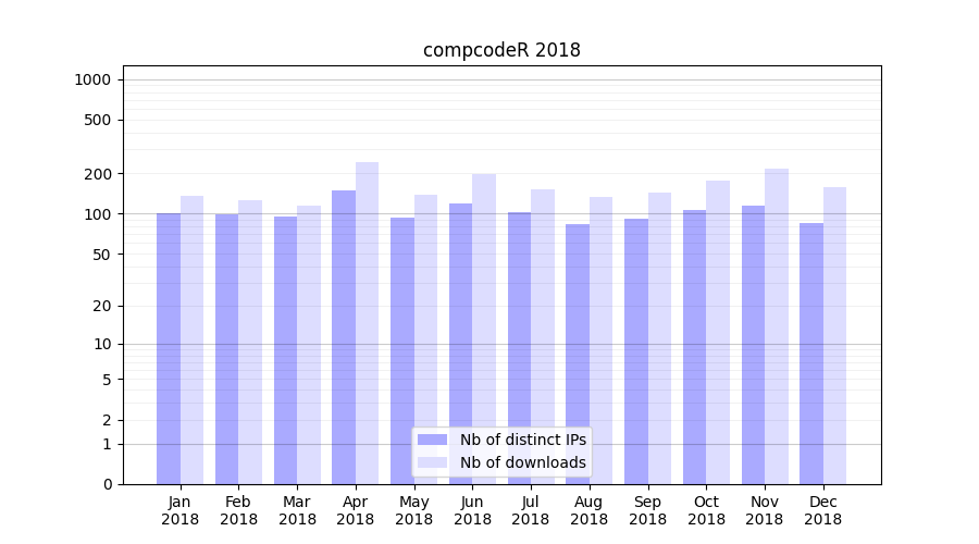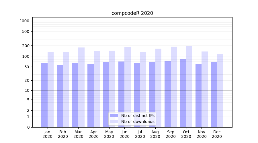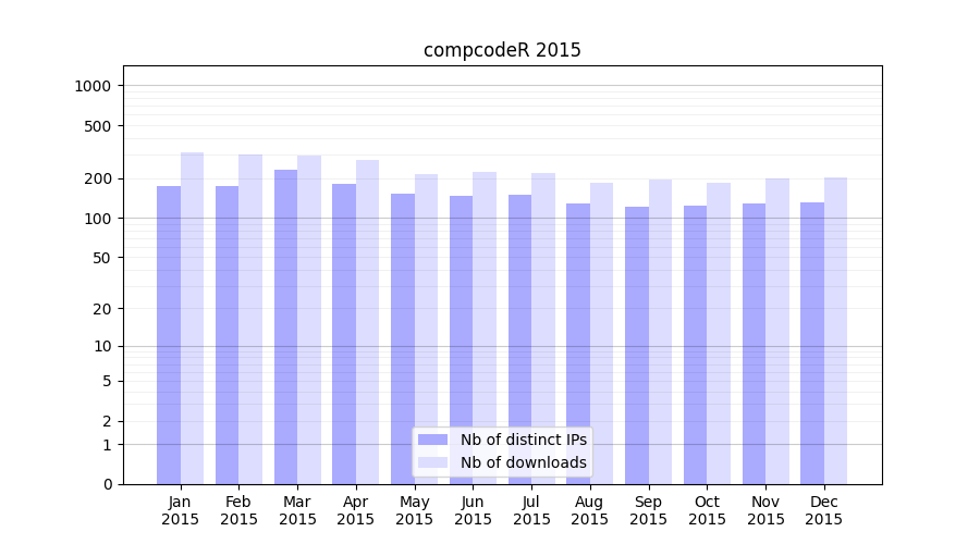 Number of downloads for software package compcodeR, year by year, from 2025 back to 2014 (years with no downloads are omitted):