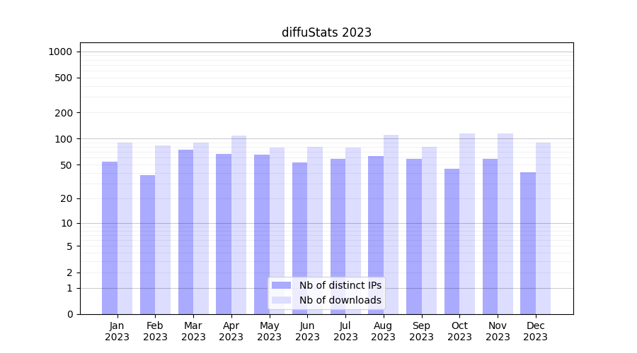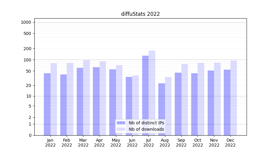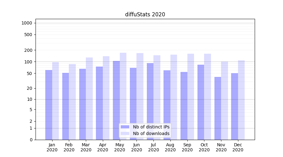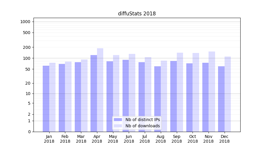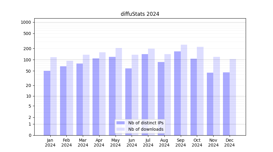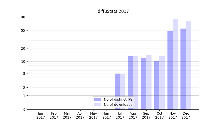Number of downloads for software package diffuStats, year by year, from 2025 back to 2014 (years with no downloads are omitted):