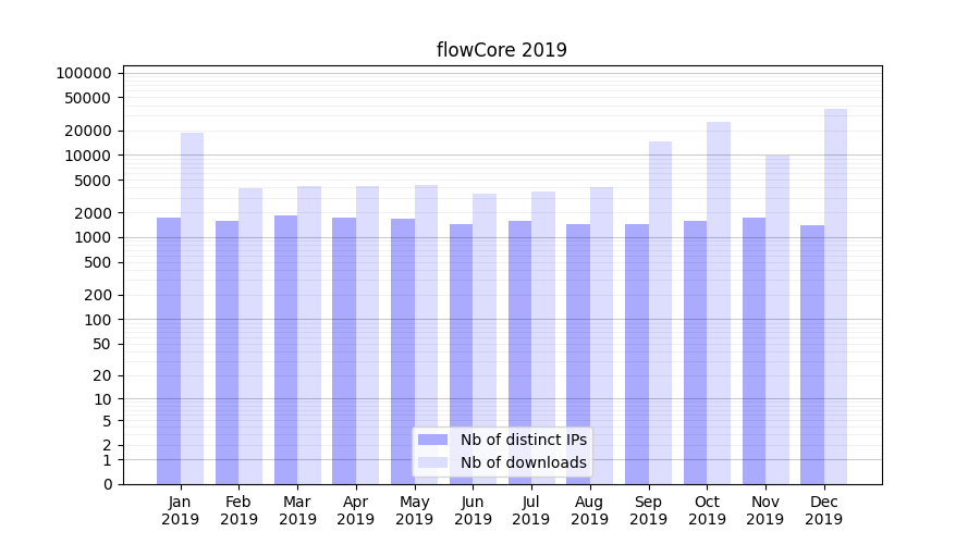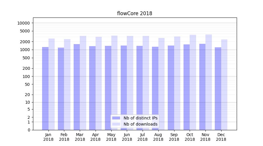 Number of downloads for software package flowCore, year by year, from 2025 back to 2014 (years with no downloads are omitted):