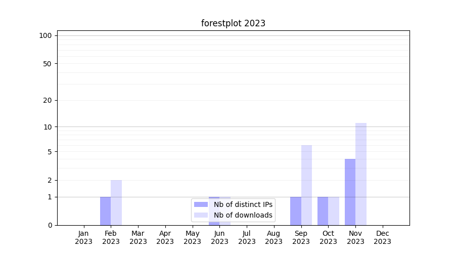 Number of downloads for software package forestplot, year by year, from 2025 back to 2014 (years with no downloads are omitted):