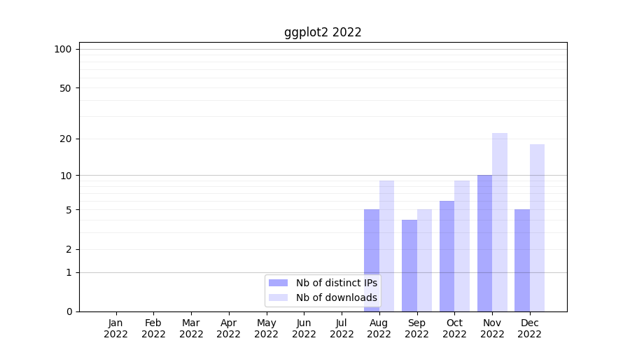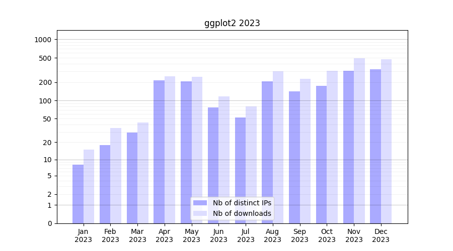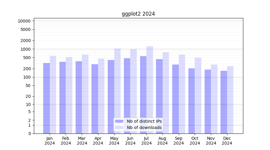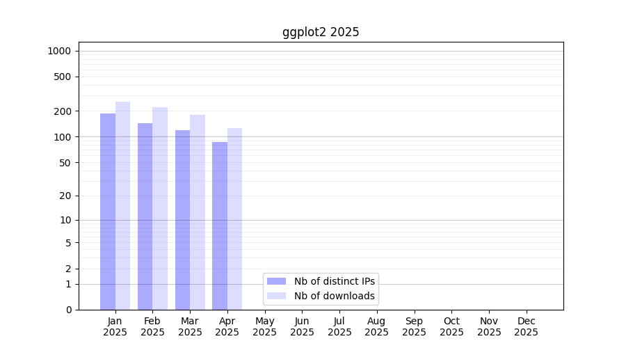 Number of downloads for software package ggplot2, year by year, from 2025 back to 2014 (years with no downloads are omitted):