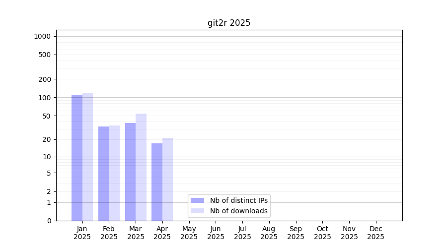 Number of downloads for software package git2r, year by year, from 2025 back to 2014 (years with no downloads are omitted):