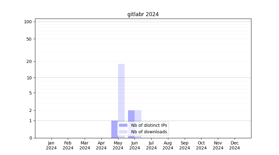 Number of downloads for software package gitlabr, year by year, from 2025 back to 2014 (years with no downloads are omitted):