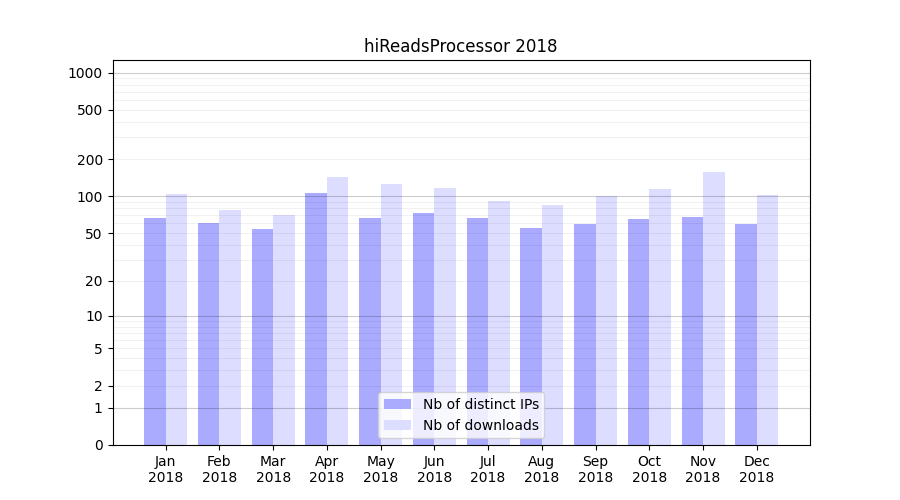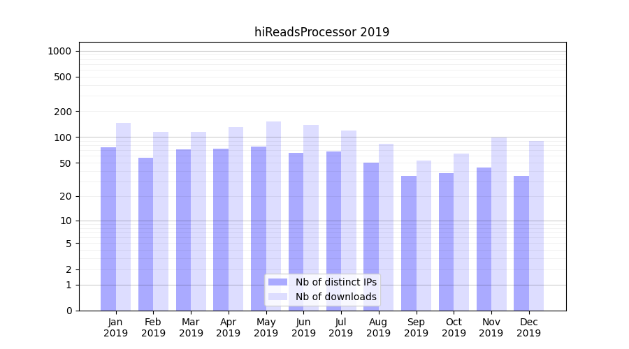 Number of downloads for software package hiReadsProcessor, year by year, from 2025 back to 2014 (years with no downloads are omitted):