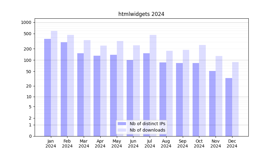 Number of downloads for software package htmlwidgets, year by year, from 2025 back to 2014 (years with no downloads are omitted):