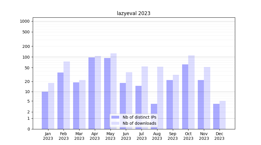 Number of downloads for software package lazyeval, year by year, from 2025 back to 2014 (years with no downloads are omitted):