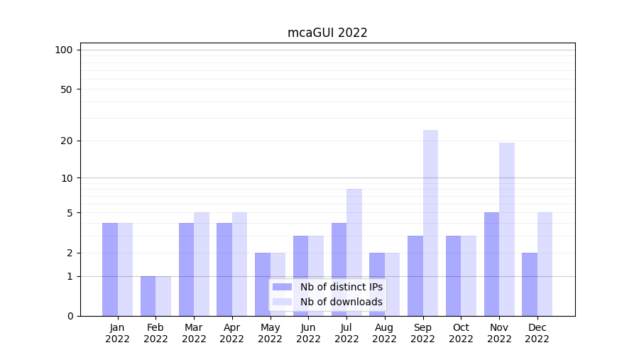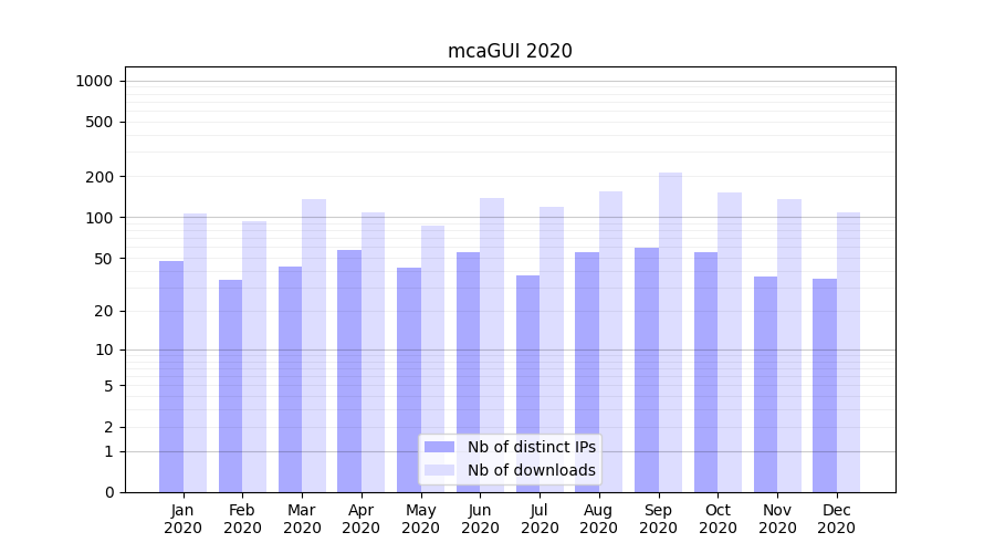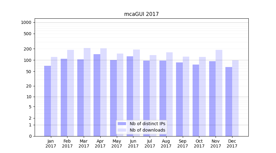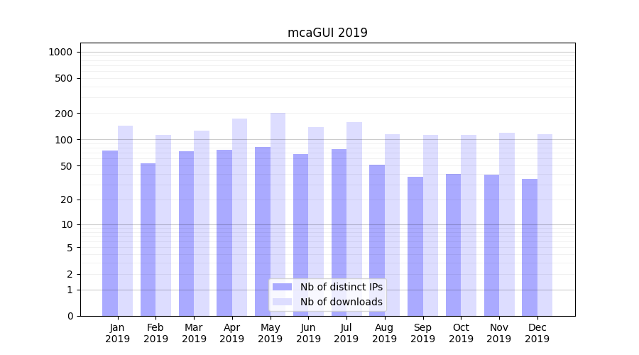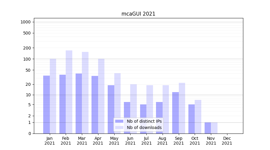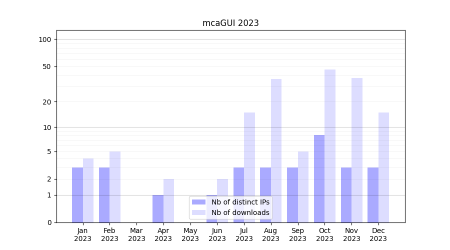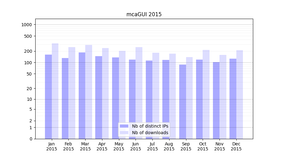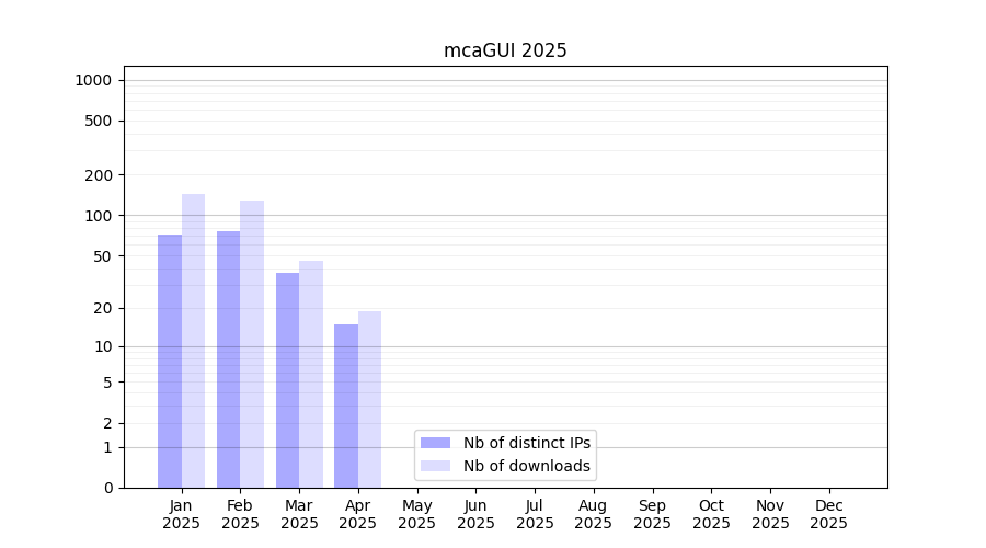 Number of downloads for software package mcaGUI, year by year, from 2025 back to 2014 (years with no downloads are omitted):