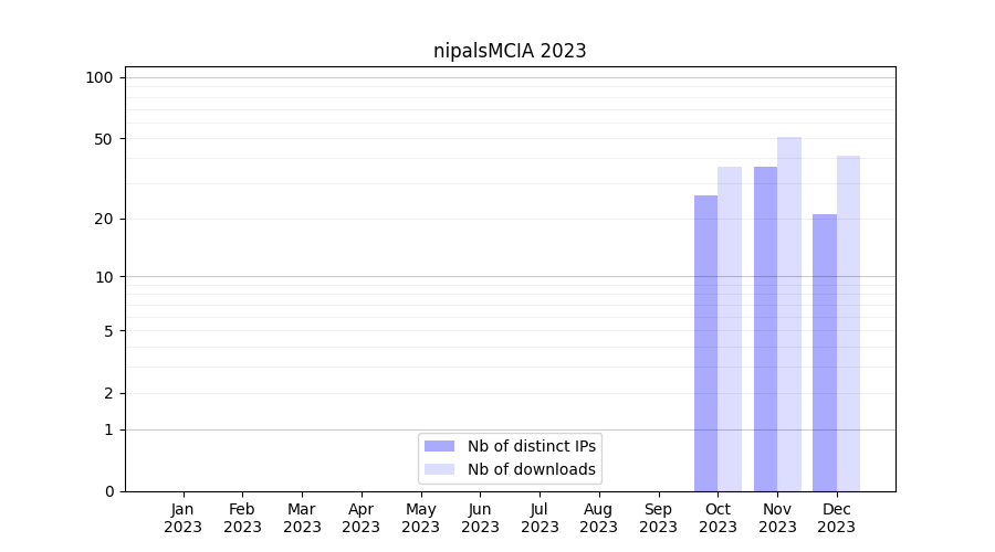 Number of downloads for software package nipalsMCIA, year by year, from 2025 back to 2014 (years with no downloads are omitted):