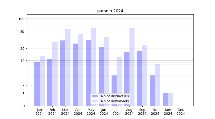 Number of downloads for software package parsnip, year by year, from 2025 back to 2014 (years with no downloads are omitted):