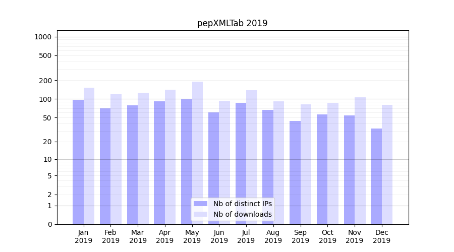 Number of downloads for software package pepXMLTab, year by year, from 2025 back to 2014 (years with no downloads are omitted):