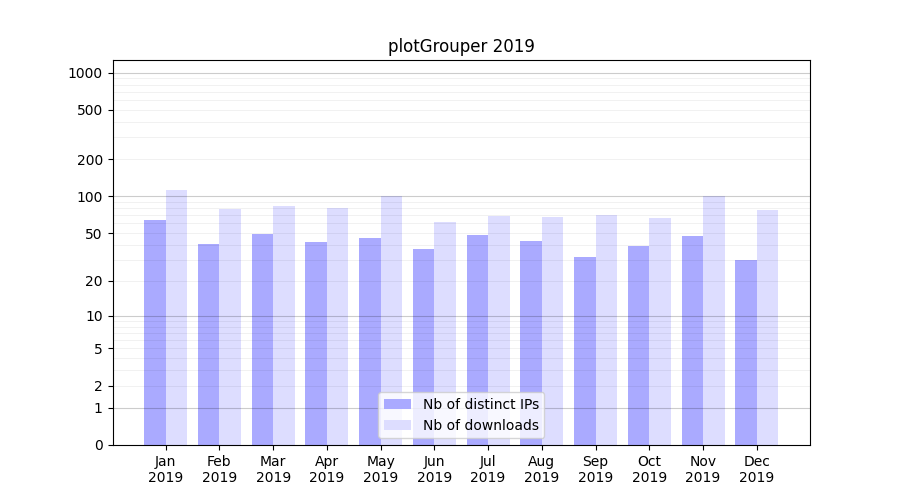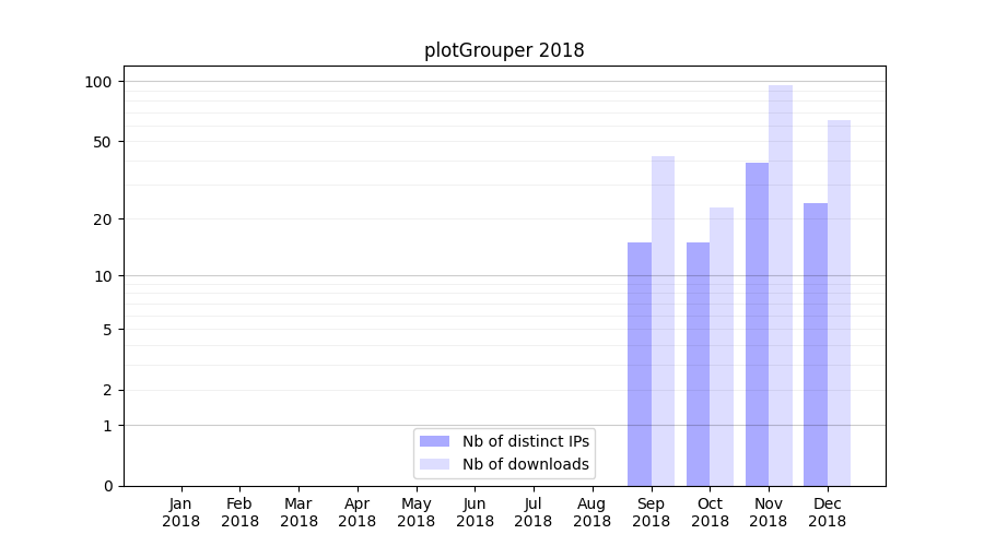 Number of downloads for software package plotGrouper, year by year, from 2025 back to 2014 (years with no downloads are omitted):