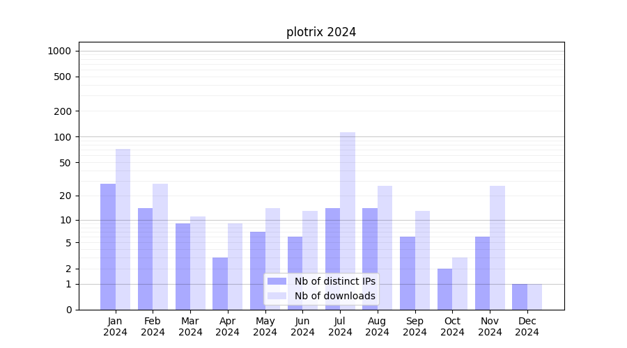Number of downloads for software package plotrix, year by year, from 2025 back to 2014 (years with no downloads are omitted):