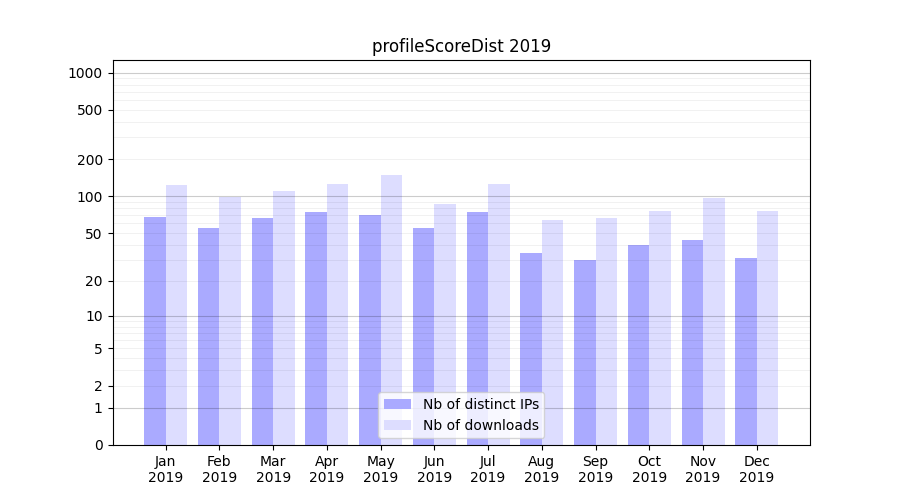Number of downloads for software package profileScoreDist, year by year, from 2025 back to 2014 (years with no downloads are omitted):