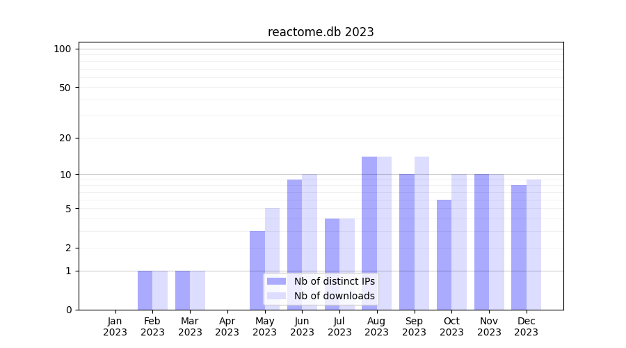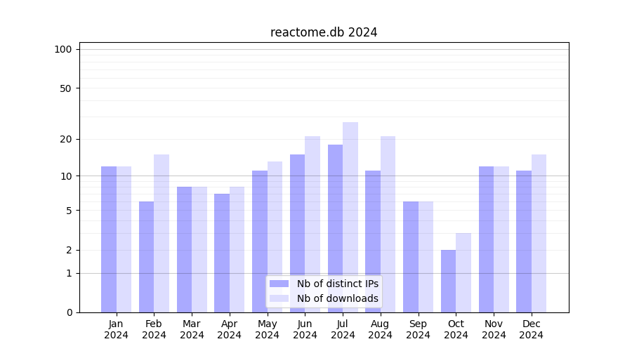 Number of downloads for software package reactome.db, year by year, from 2025 back to 2014 (years with no downloads are omitted):