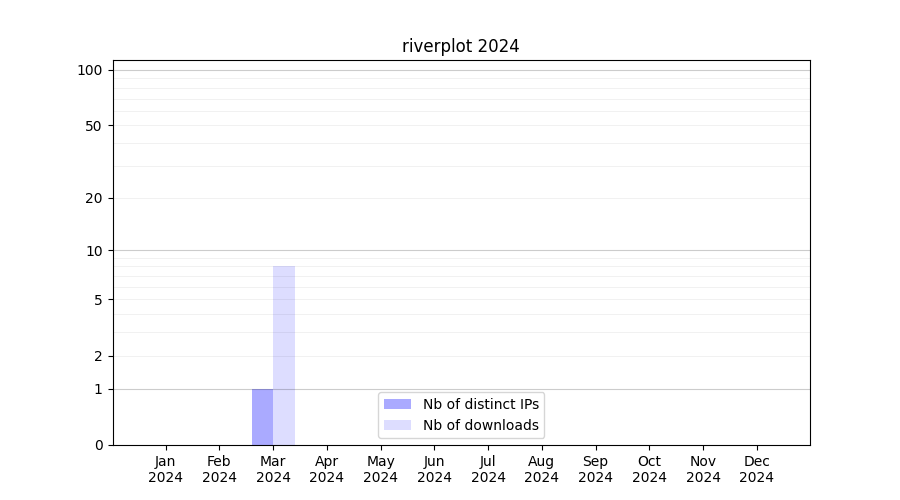 Number of downloads for software package riverplot, year by year, from 2025 back to 2014 (years with no downloads are omitted):