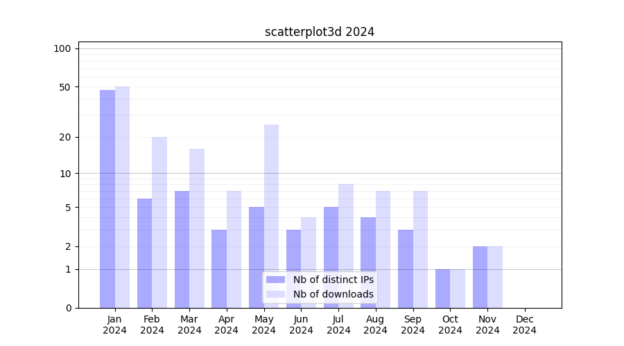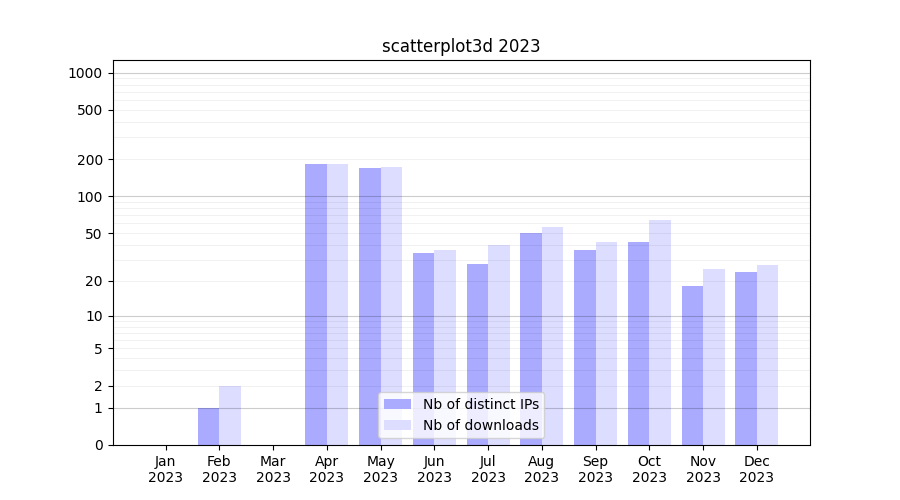 Number of downloads for software package scatterplot3d, year by year, from 2025 back to 2014 (years with no downloads are omitted):