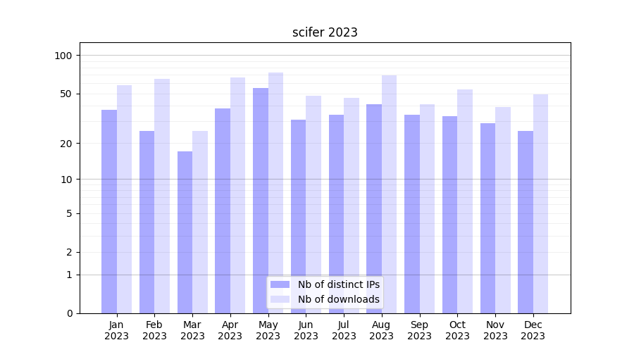 Number of downloads for software package scifer, year by year, from 2025 back to 2014 (years with no downloads are omitted):