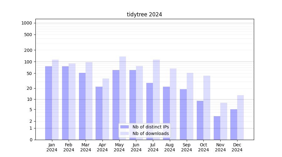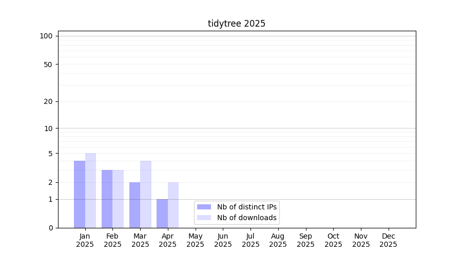 Number of downloads for software package tidytree, year by year, from 2025 back to 2014 (years with no downloads are omitted):