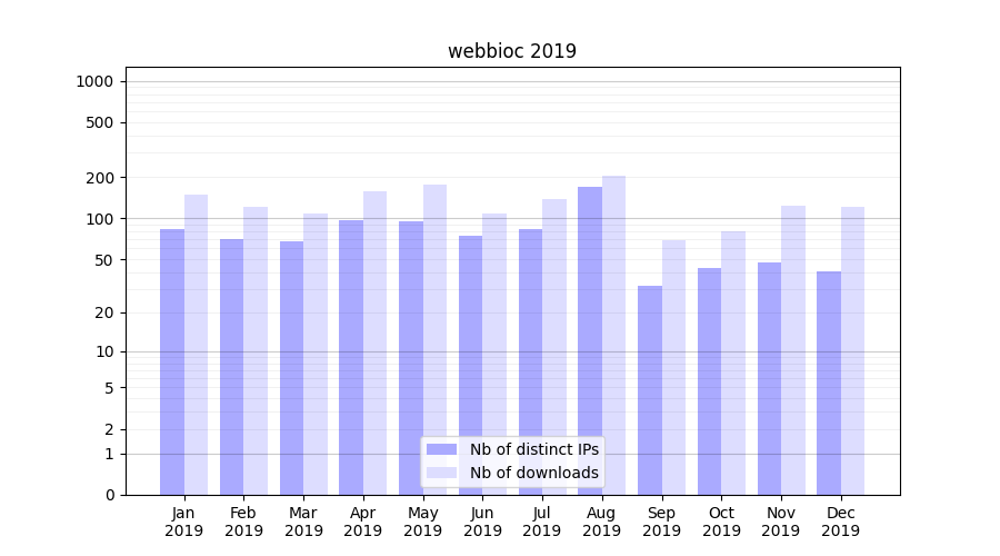 Number of downloads for software package webbioc, year by year, from 2025 back to 2014 (years with no downloads are omitted):
