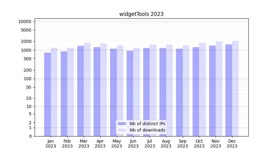 Number of downloads for software package widgetTools, year by year, from 2025 back to 2014 (years with no downloads are omitted):
