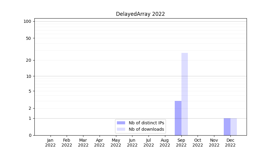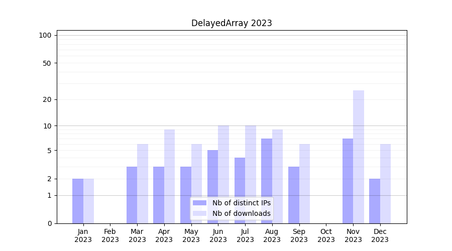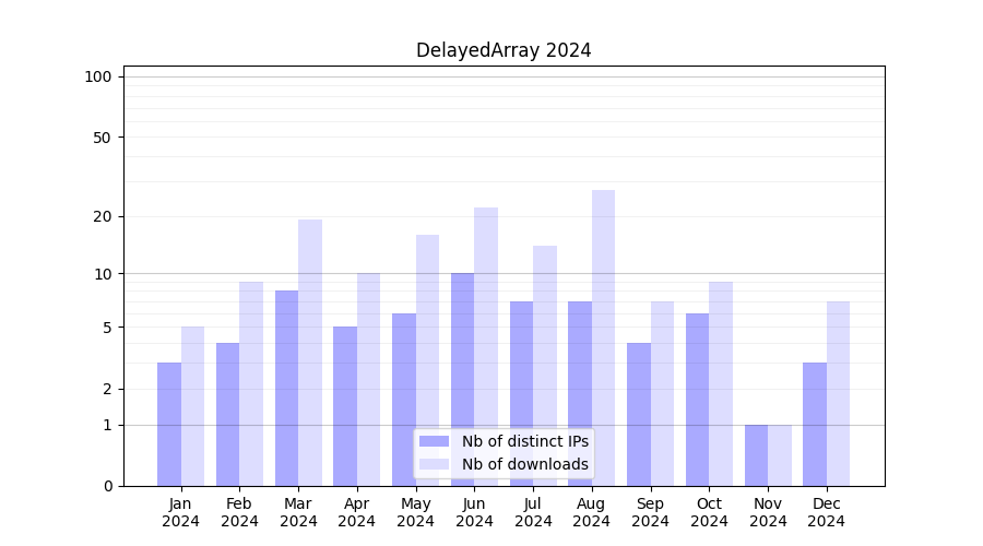 Number of downloads for annotation package DelayedArray, year by year, from 2025 back to 2014 (years with no downloads are omitted):