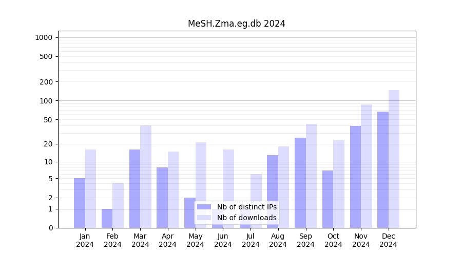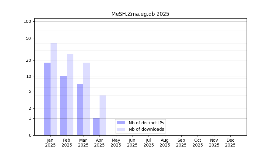 Number of downloads for annotation package MeSH.Zma.eg.db, year by year, from 2025 back to 2014 (years with no downloads are omitted):