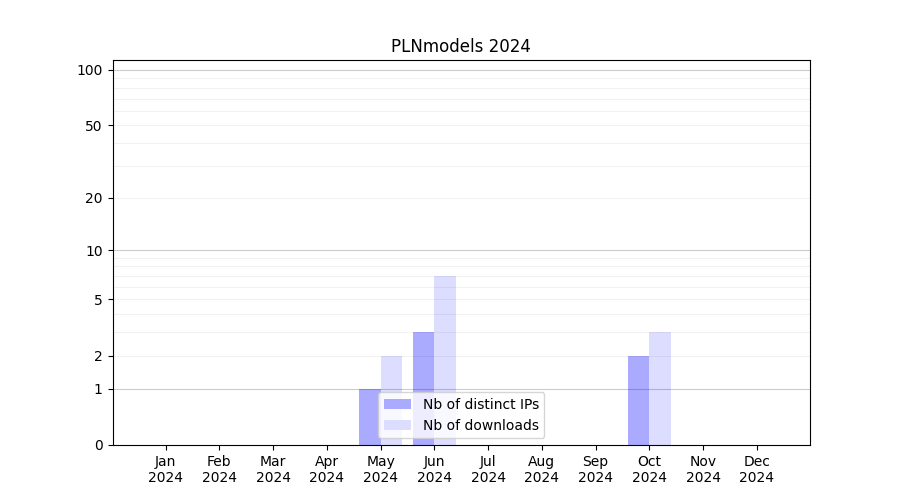Number of downloads for annotation package PLNmodels, year by year, from 2025 back to 2014 (years with no downloads are omitted):