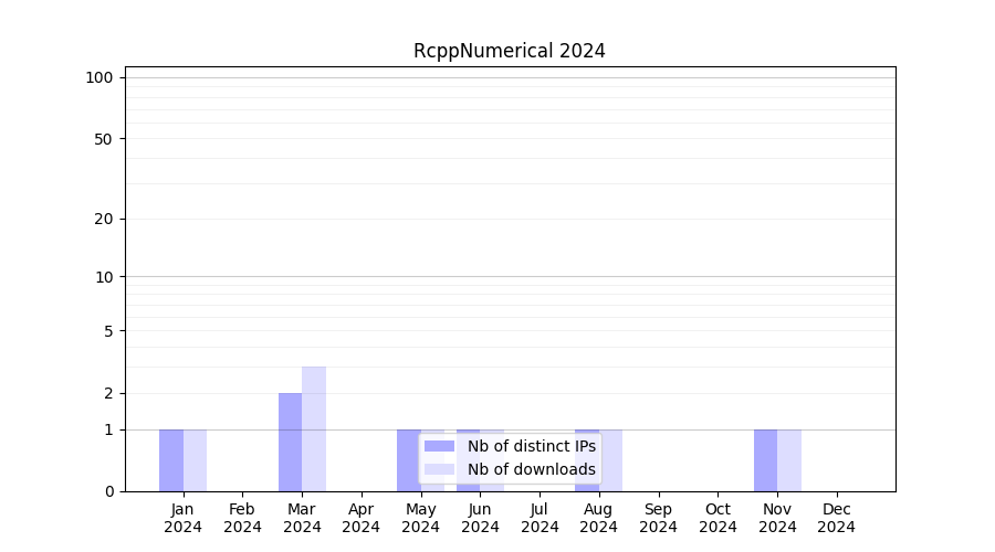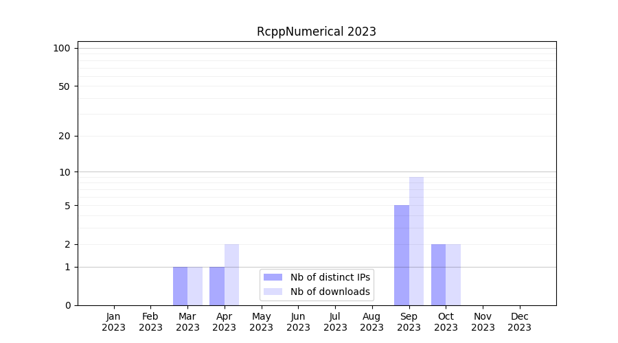 Number of downloads for annotation package RcppNumerical, year by year, from 2025 back to 2014 (years with no downloads are omitted):