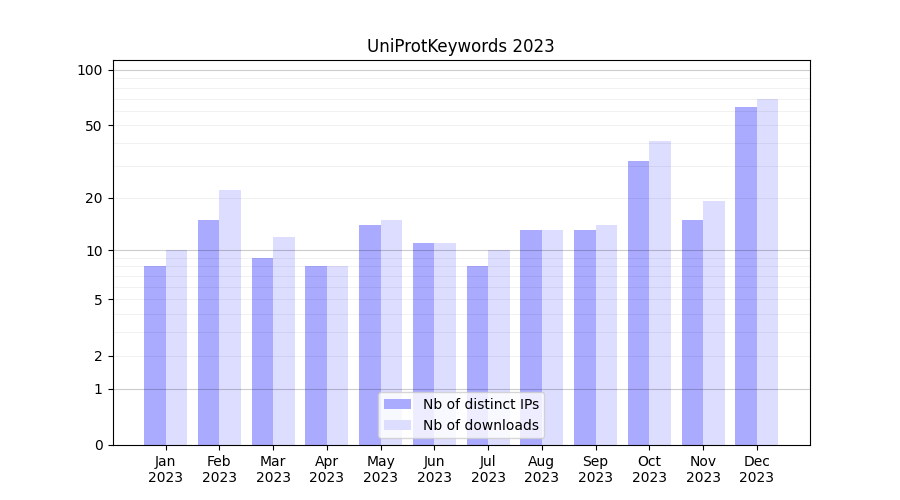 Number of downloads for annotation package UniProtKeywords, year by year, from 2025 back to 2014 (years with no downloads are omitted):