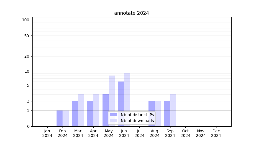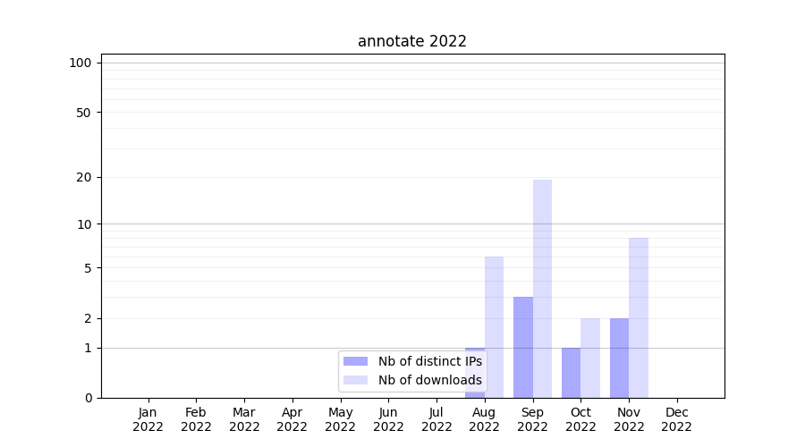 Number of downloads for annotation package annotate, year by year, from 2025 back to 2014 (years with no downloads are omitted):