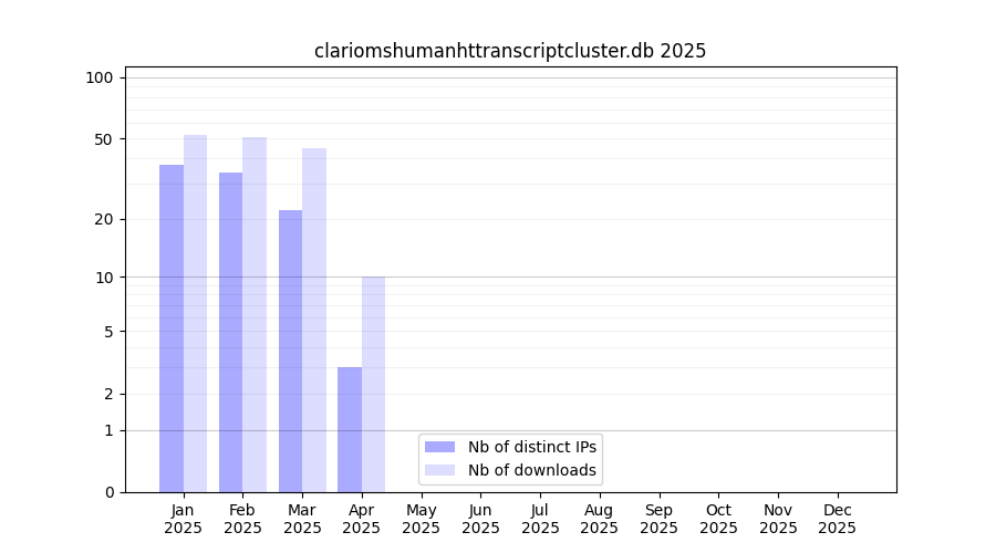 Number of downloads for annotation package clariomshumanhttranscriptcluster.db, year by year, from 2025 back to 2014 (years with no downloads are omitted):