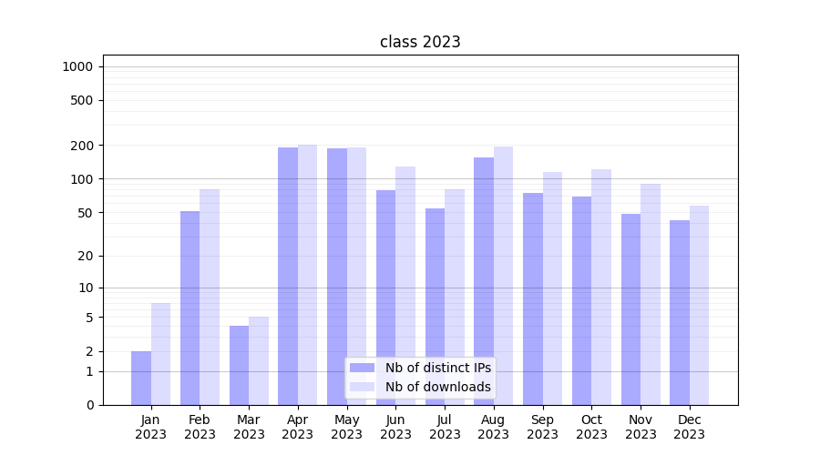 Number of downloads for annotation package class, year by year, from 2025 back to 2014 (years with no downloads are omitted):