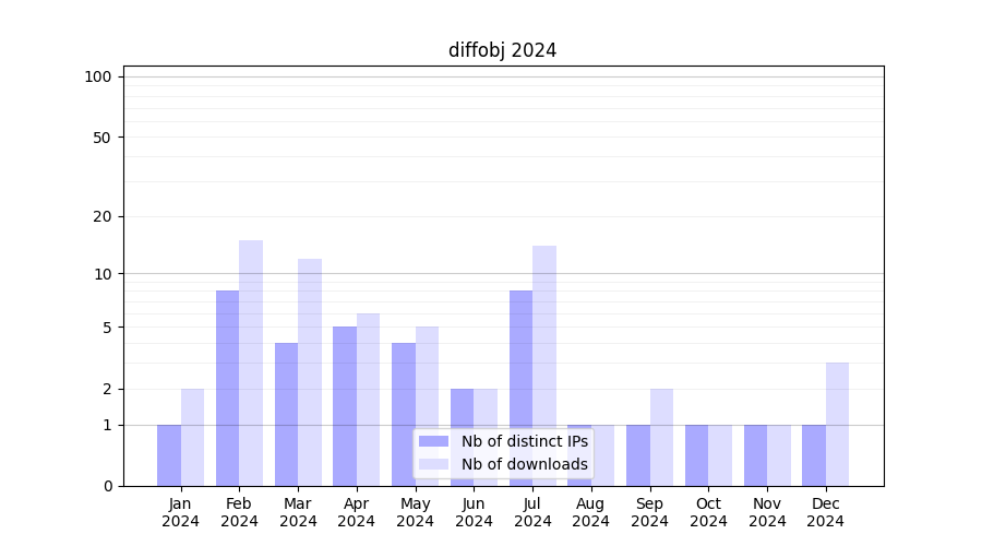 Number of downloads for annotation package diffobj, year by year, from 2025 back to 2014 (years with no downloads are omitted):