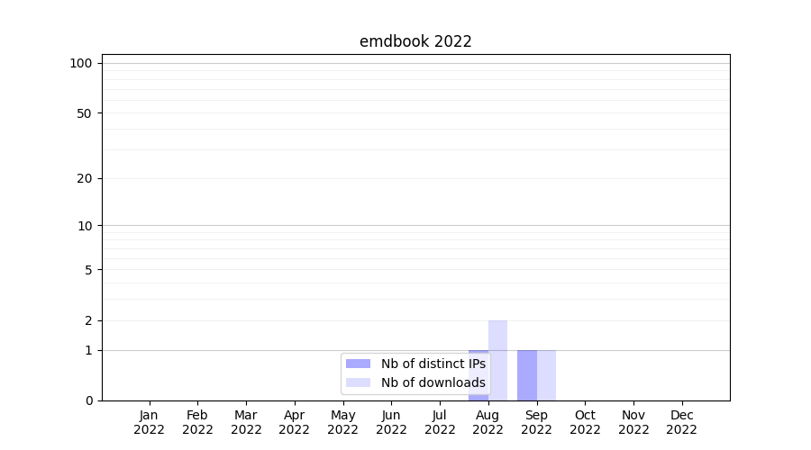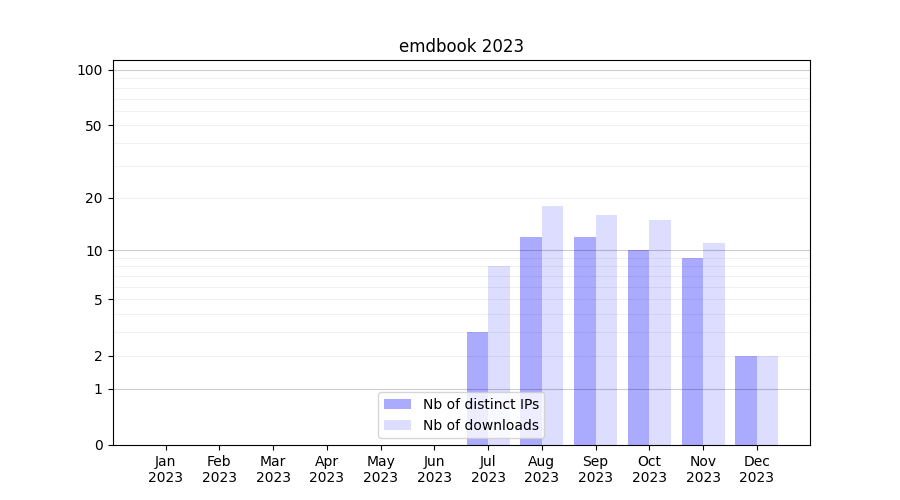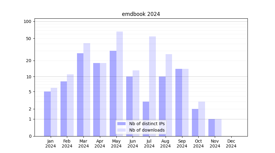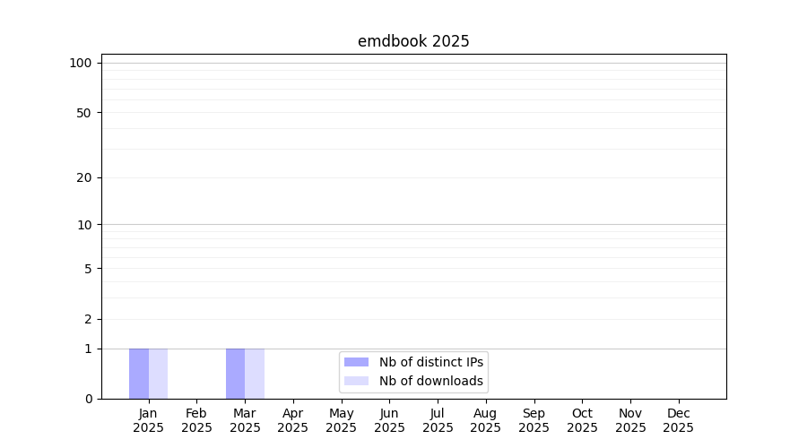 Number of downloads for annotation package emdbook, year by year, from 2025 back to 2014 (years with no downloads are omitted):