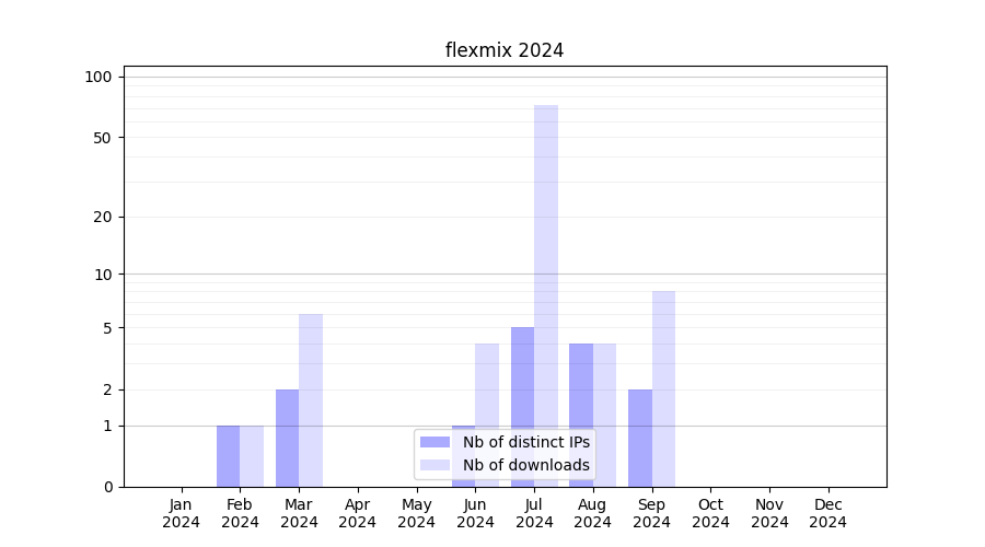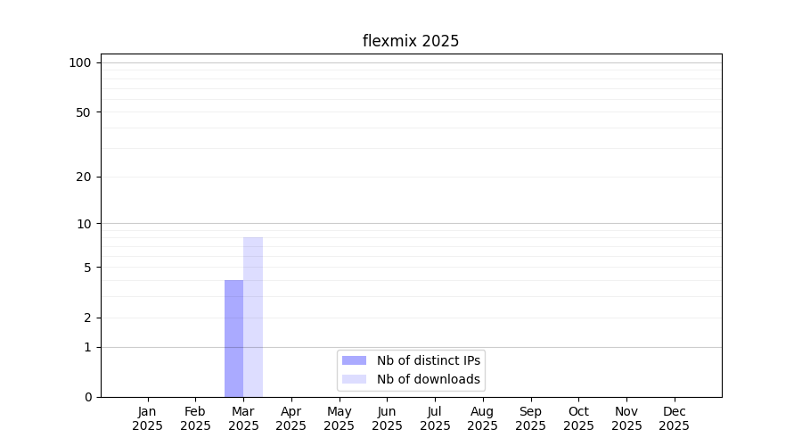 Number of downloads for annotation package flexmix, year by year, from 2025 back to 2014 (years with no downloads are omitted):