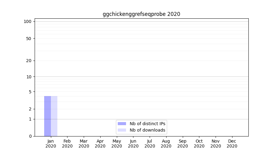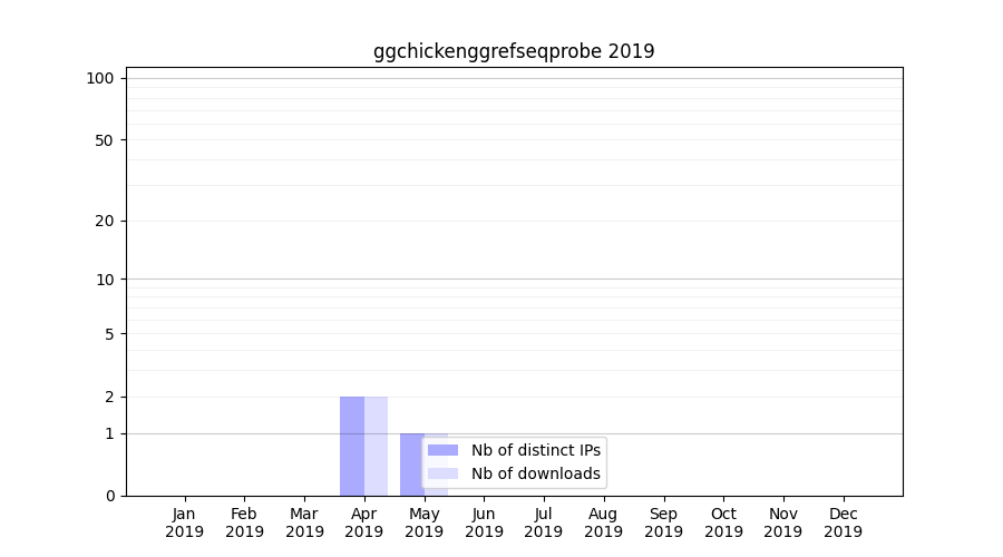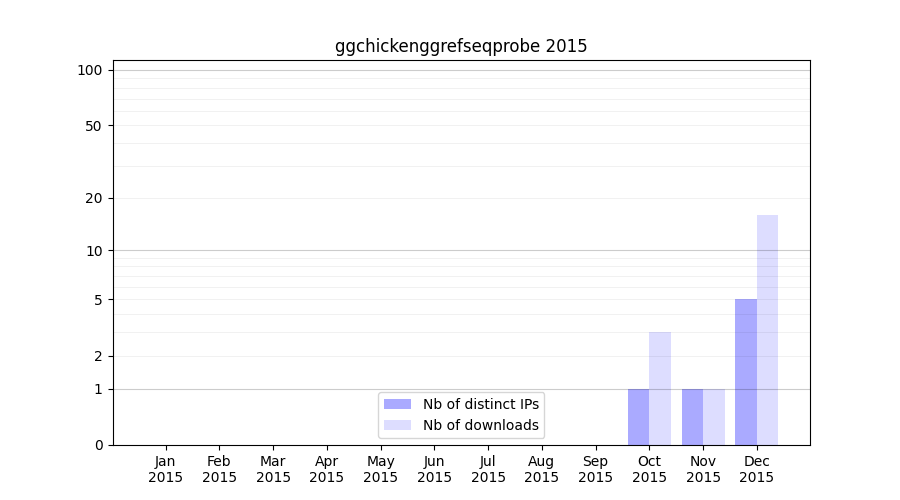 Number of downloads for annotation package ggchickenggrefseqprobe, year by year, from 2025 back to 2014 (years with no downloads are omitted):