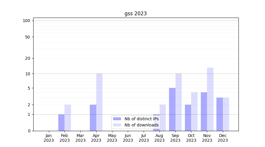 Number of downloads for annotation package gss, year by year, from 2025 back to 2014 (years with no downloads are omitted):
